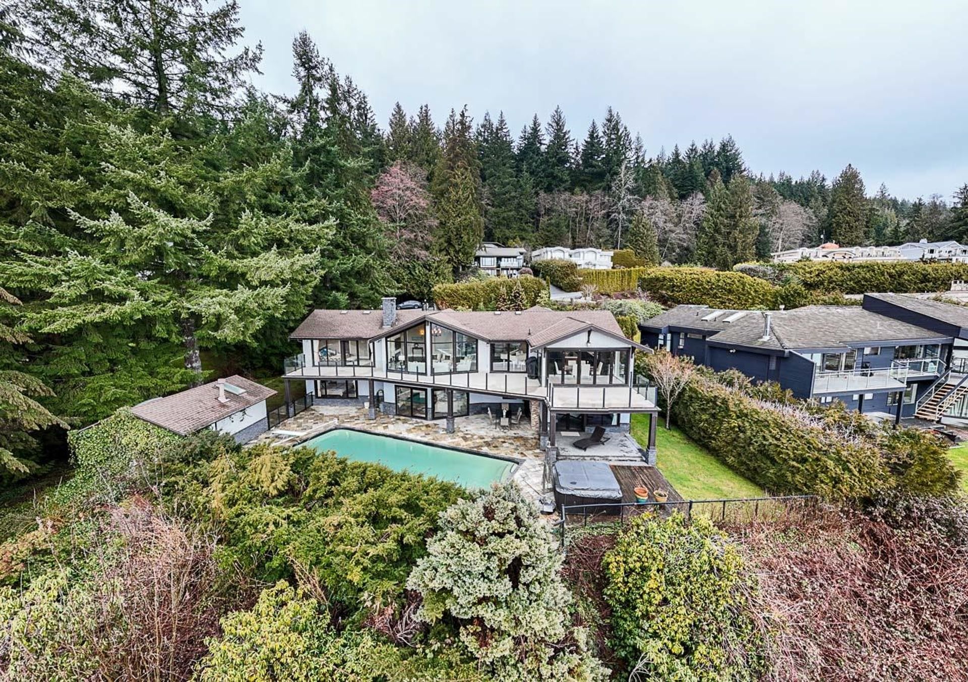 BREATHTAKING WATER & CITY VIEWS from both levels of this updated Chartwell home - with no power lines in sight! This MOVE-IN READY HOME sits on a large private, gated lot w/ gently sloped driveway & sun-drenched, SOUTH-FACING backyard featuring a 40' x 20' pool, hot tub, outdoor fireplace & multiple terraces-perfect for relaxation & entertaining. Renovated in 2010 with recent updates, this home boasts a spacious open-concept layout, soaring cathedral ceilings, folding patio doors, primary bdrm on main, spa-inspired bathrooms,sauna, gourmet kitchen & wok kitchen. Ideally located on one of West Van's most prestigious streets-minutes from top schools & amenities. BEST VALUE RENOVATED VIEW HOME IN CHARTWELL! *OPEN HOUSE SUNDAY, MAY 11, 2-4 PM*
